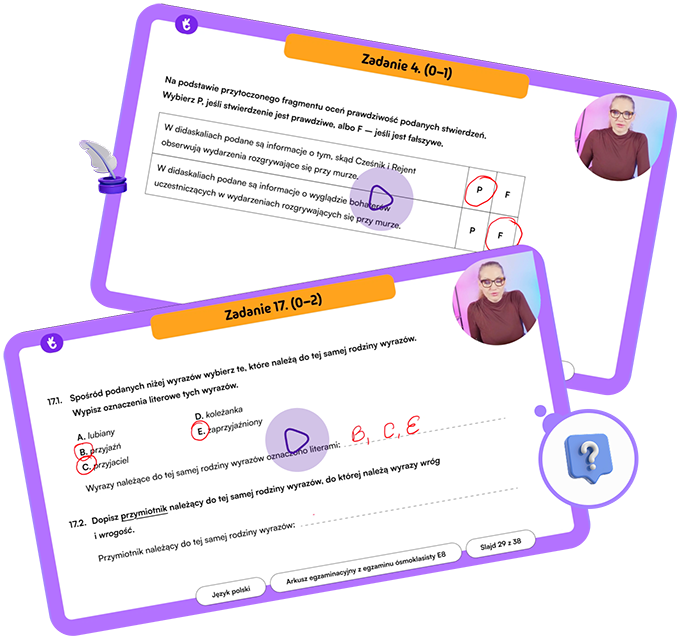 Rozwiązuj arkusze egzaminacyjne i zobacz, czego się nauczyłeś. Obejrzyj wideo, na którym nauczyciele tłumaczą, jak rozwiązać zadania i jakich błędów unikać na egzaminie E8.