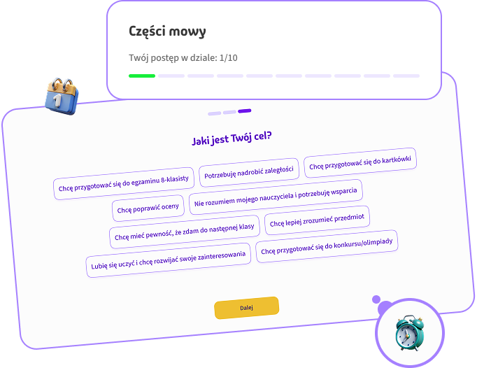 W przygotowaniach do egzaminu ósmoklasisty najważniejsza jest strategia. Nie chodzi o to, abyś zakuwał godzinami. Przyswajaj wiedzę dwa razy szybciej - oglądaj lekcje wideo z powtórkami kluczowych zagadnień i utrwalaj wiedzę dzięki interaktywnym materiałom takim jak fiszki, quizy, mapy myśli, karty pracy.